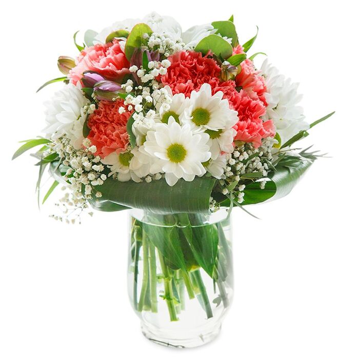Brimming with light and promise, this bouquet feels like a fresh morning in Hornsey-bursting with colour and quietly celebratory spirit. Coral and peach carnations, each petal softly frilled and luminous, bring warmth and a gentle, comforting fragrance to the arrangement. Sprays of pure white daisies with sunny lime centers nestle companionably within, their crisp contours contributing a sense of cheerful elegance. Whimsical clouds of baby's breath drift through the bouquet, imbuing it with an airy innocence that calls to mind the first blossoms seen in spring near Alexandra Palace. Deep green, glossy foliage cradles everything with a graceful flourish, holding the flowers upright and shaping the bouquet into a harmonious, rounded form. Subtle clusters of closed, purple-edged buds add visual intrigue and a whisper of anticipation. The flowers are thoughtfully arranged in a squared white gift bag, its sturdy handles ready for easy delivery-perhaps to a neighbour on Church Lane or a friend celebrating nearby. Every stem appears carefully placed, the overall effect natural yet expertly composed, creating a feeling of genuine, uplifting joy. Perfect for birthdays, anniversaries, or spontaneous acts of kindness, this bouquet radiates not just freshness but the caring artistry and community spirit of a trusted Hornsey florist. This exuberant bouquet, photographed from above on a pure white background, brings together the radiant hues and textures that define Hornsey's love of floral artistry. At its center, clusters of lively white daisies with vivid green centers bask in soft, natural light, set off by plush coral-pink carnations that radiate warmth and gentle sophistication. Wispy clouds of delicate baby's breath drift between the blooms, adding dimension and the whisper of a summer's breeze travelling through Priory Park. Slender stems tipped with unopened alstroemeria buds, each streaked in gentle shades of purple and pink, hint at ongoing cycles of growth and beauty. Eucalyptus foliage-both silvery-soft and deep rich green-creates a harmonious base, framing the round composition while introducing cool, calming fragrance reminiscent of local floral workshops. Crafted with intentional care, this bouquet embodies the joy and generosity found in Hornsey's close-knit neighbourhoods. Ideal for celebrating milestones, expressing heartfelt thanks, or simply bringing a dose of cheer into a cherished home, the arrangement stands as a visual and sensory testament to what expert floristry can offer. This beautifully arranged bouquet embodies the vibrant heart of Hornsey, as if gathered in celebration of a new season along bustling Hornsey High Street. Fluffy coral-pink carnations take centre stage, their ruffled petals conveying both energy and affection, surrounded by radiant white chrysanthemums and classic daisies with sunny yellow-green centres. Wisps of frothy baby's breath wend between the larger blooms, softening the bouquet's silhouette with cloud-like delicacy and adding a gentle, uplifting touch reminiscent of quiet moments in nearby Queen's Wood. Glossy green foliage forms a nurturing collar at the base, the leaves catching the light and grounding the arrangement with freshness. A few magenta alstroemeria buds peek thoughtfully from behind, adding richness to the colour story and hinting at blooms yet to open. The clear glass vase, filled with pure water, showcases each green stem-a reassuring sign of locally sourced, freshly delivered flowers by Hornsey's trusted florists. Every blossom and leaf stands out against the backdrop of smooth white, with no stray shadows-only inviting brightness and comfort. Whether chosen for a cheerful birthday, a thank-you gesture, or a comforting gift delivered across Hornsey, this bouquet exudes the optimism and care of a true neighbourhood floral creation.